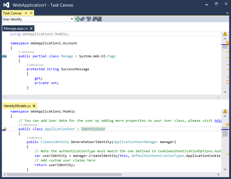 The Task Canvas extension for Visual Studio 2015 lets you edit multiple methods from different classes in one window and quickly switch between document groups.