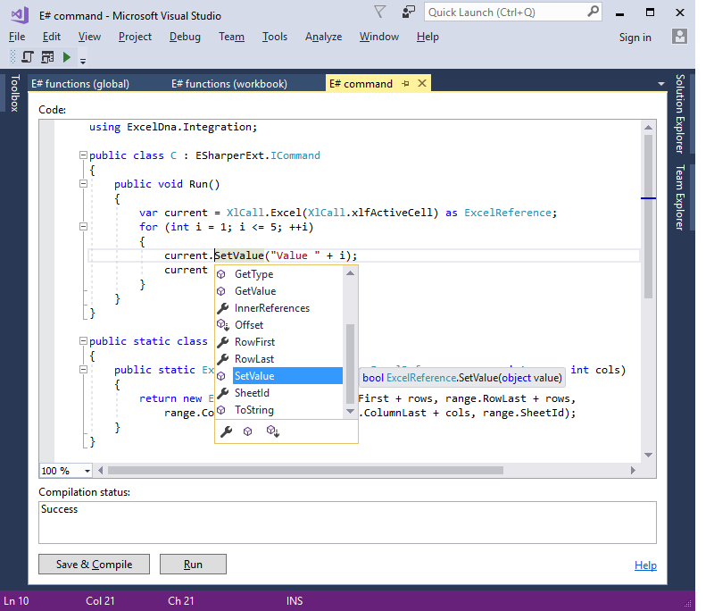 ESharper is an Excel add-in that lets you write user defined functions and commands using C# interactively in a live Excel session.