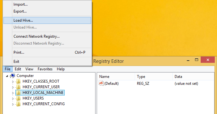 To edit this file in Registry Editor, first make sure Visual Studio is closed (plus it takes about 20 seconds for all Visual Studio background process to shutdown), then select HKEY_LOCAL_MACHINE or HKEY_USERS and then File – Load Hive…:
