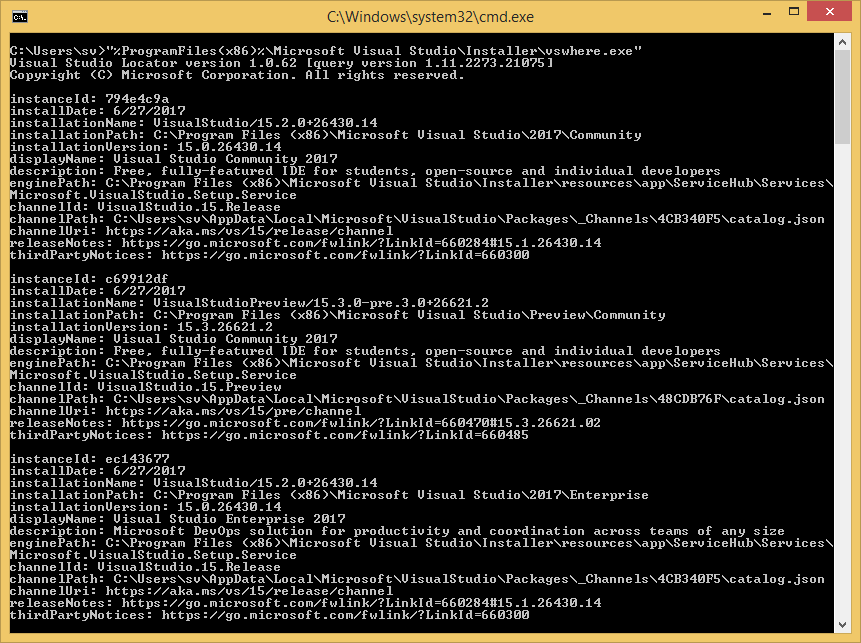 If you do have multiple instances of VS 2017 installed (e.g. Community and Enterprise, or a general release and a preview) and want to find corresponding instance ids, you can use the Visual Studio Locator utility. Included with the installer as of Visual Studio 2017 version 15.2 and later at %ProgramFiles(x86)%\Microsoft Visual Studio\Installer\vswhere.exe: