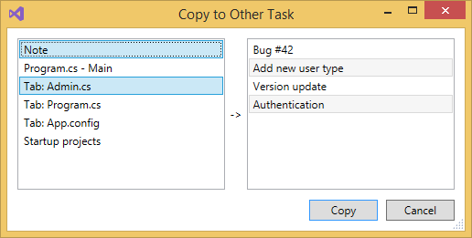 v1.6 adds the ability to copy notes, code blocks, tabs and startup projects from the current task to other tasks using the “Copy to Other Task” dialog: