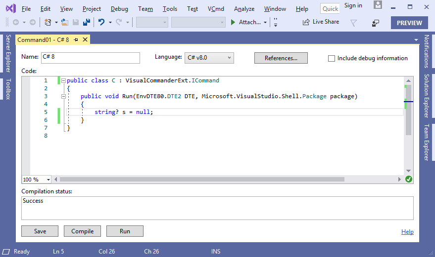 Visual Commander Professional v3.1.0 adds the ability to use C# v8 features like nullable reference types in Visual Studio 2019 to compile snippets: