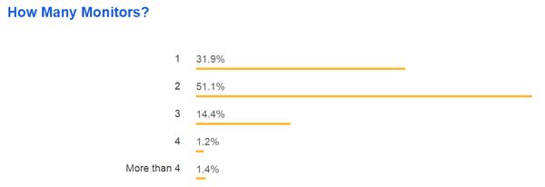 From Stack Overflow Developer Survey 2018, 68.1% of developers have two or more monitors: