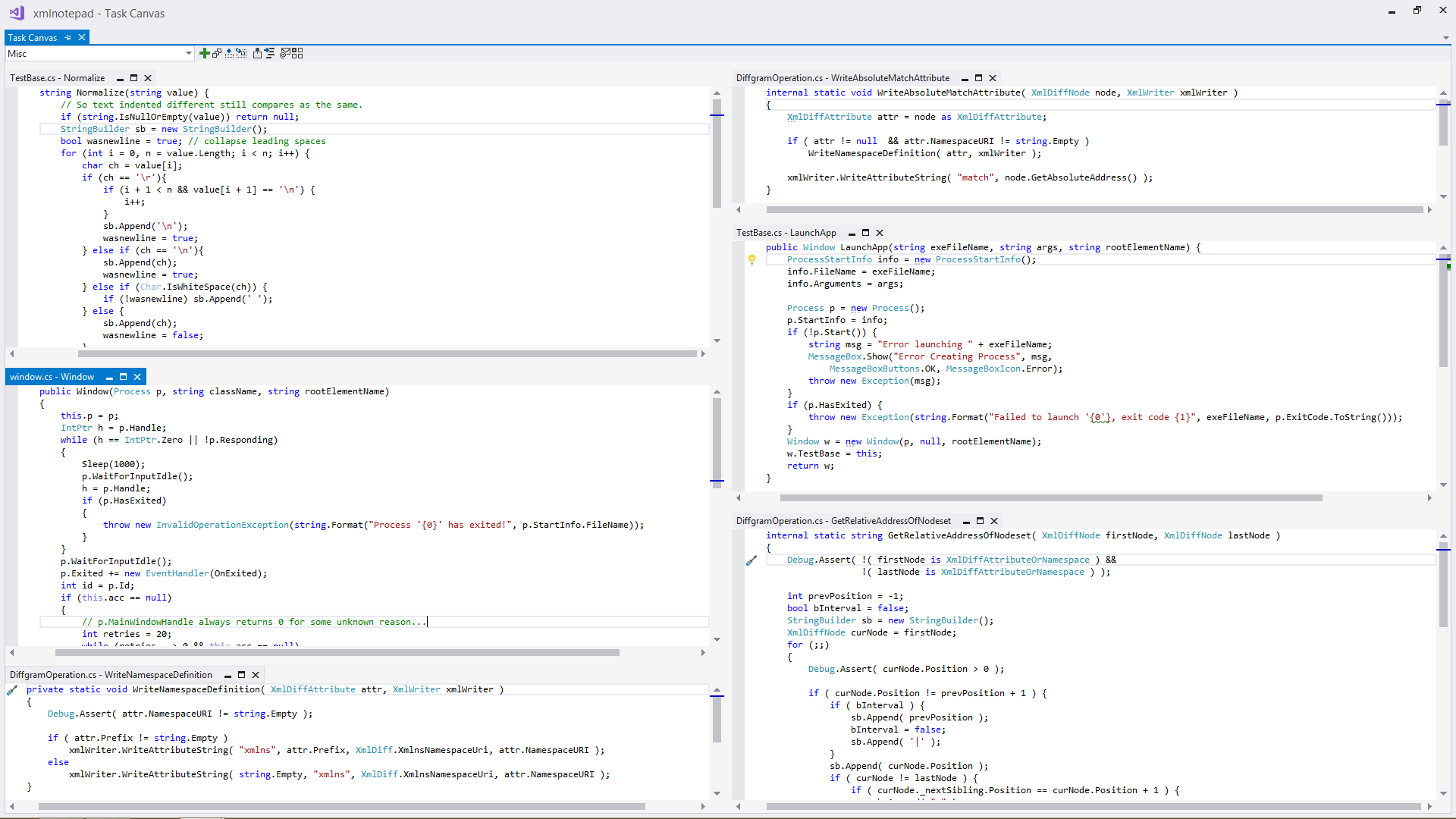 In 2016 I personally became tired of switching back and forth between tabs and jumping from place to place within a file. I wanted to see all code fragments I’m currently working on at once. In May 2016 I released Task Canvas for Visual Studio 2015/2017.